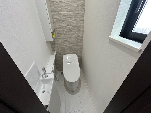その他 | バス1坪以上、追焚機能、浴室暖房、浴室乾燥機、トイレ2ヶ所、温水洗浄便座、3口以上コンロ、カウンターキッチン、システムキッチン、食器洗浄乾燥機、浄水器、全居室収納、クローゼット、床下収納、都市ガス、複層ガラス、全居室フローリング、電気、上水道、下水道、モニタ付インターホン、ディンプルキー、電動シャッター、カードキー、火災警報器(報知機)、駐車場2台分、フラット35適合証明書、設計住宅性能評価取得 |